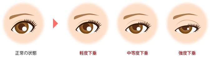 眼瞼下垂の原因は重力や加齢の影響で、目の周りの筋肉が落ちて皮膚が伸びてしまい、たるみが生じることにあります。これにより目が開けにくくなってしまうのです。上述の絵にあるように軽度、中度、強度があります。