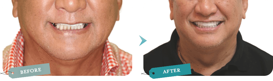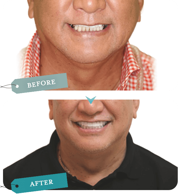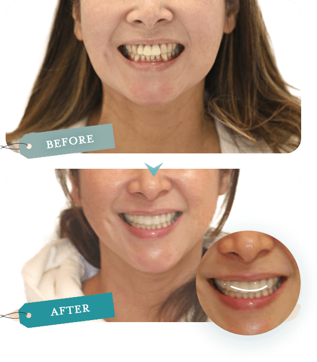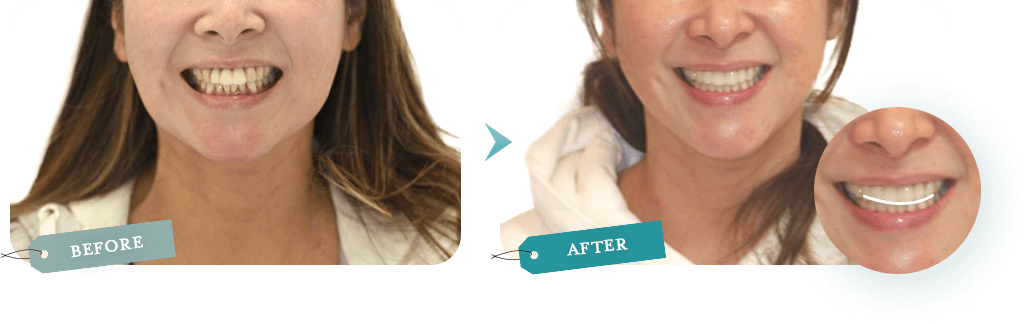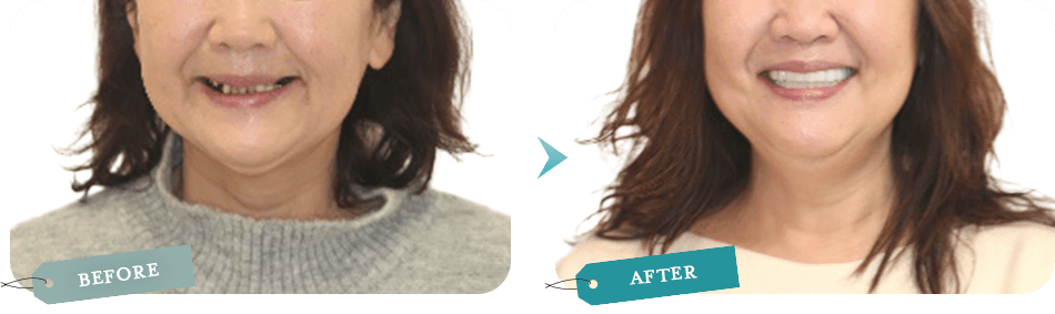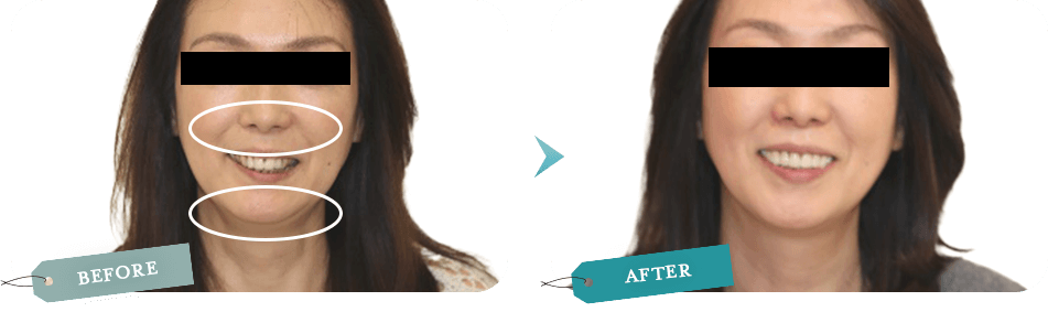 目元は出せないのですが下に引っ張られていた目尻が上に上がり見た目が20歳近く若返ったと言われ、お孫さんにもばあばの歯キレーイって言われて嬉しいと喜んでくださっています。 -