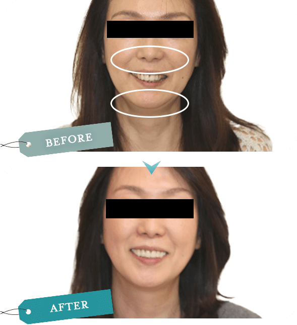 咬筋の張りがなくなり笑った時の口角の上がり方が変わりました。以前は下の前歯しか見えなかったのが上下のバランスが良いスッキリした笑顔へ。