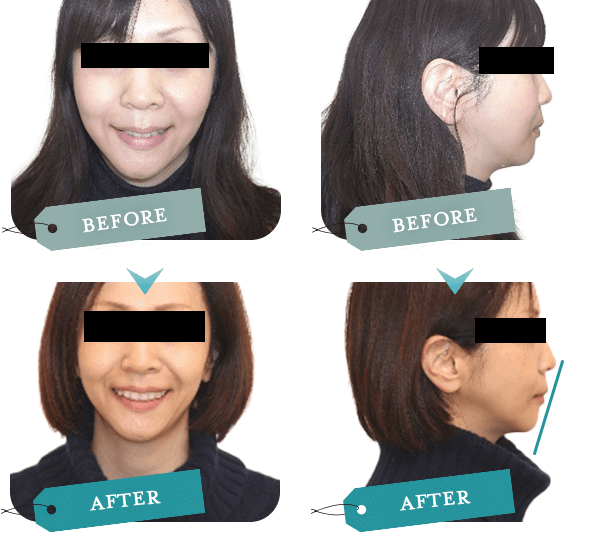 顎位を前下方に転位させているので二重アゴがなくなり、治療後3年経っていますが、ほうれい線が浅くなり頬のたるみが改善しました。 -